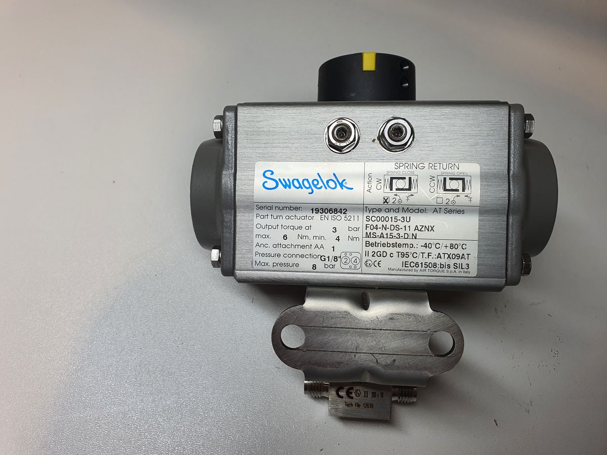 This is a Swagelok AT Series pneumatic quarter-turn actuator with spring return (fail-safe) functionality. It is designed to automate quarter-turn valves such as ball or butterfly valves. The actuator converts compressed air into rotary motion, with an internal spring mechanism that automatically returns the valve to a predefined safe position in the event of air supply failure.